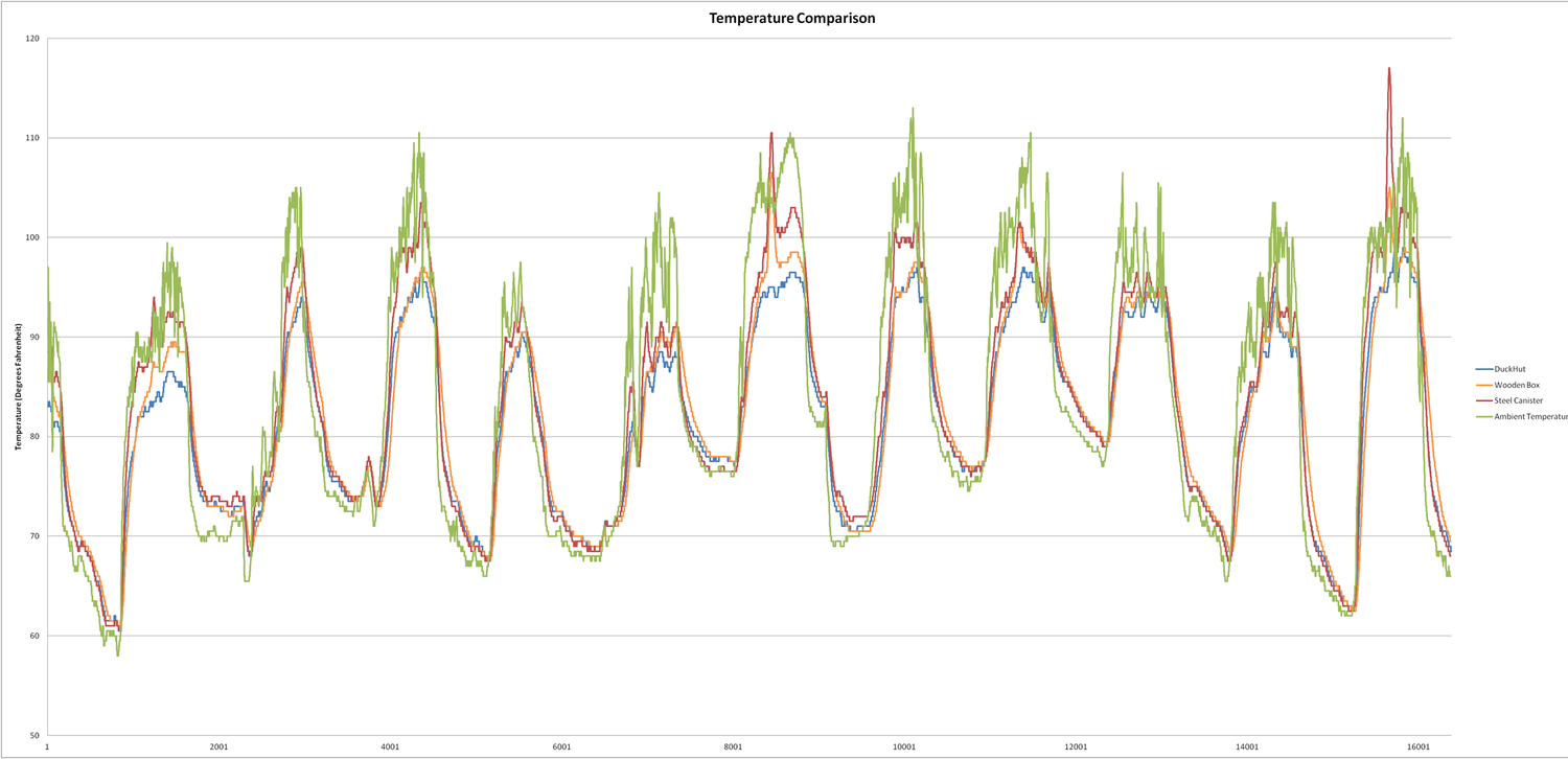 DuckHut has a perfect combination of both of these factors. The ventilation on the sides and top of the DuckHut allow hot air to escape while the plastic provides just enough insulation to even out the fluctuations of temperature that occur throughout the day.